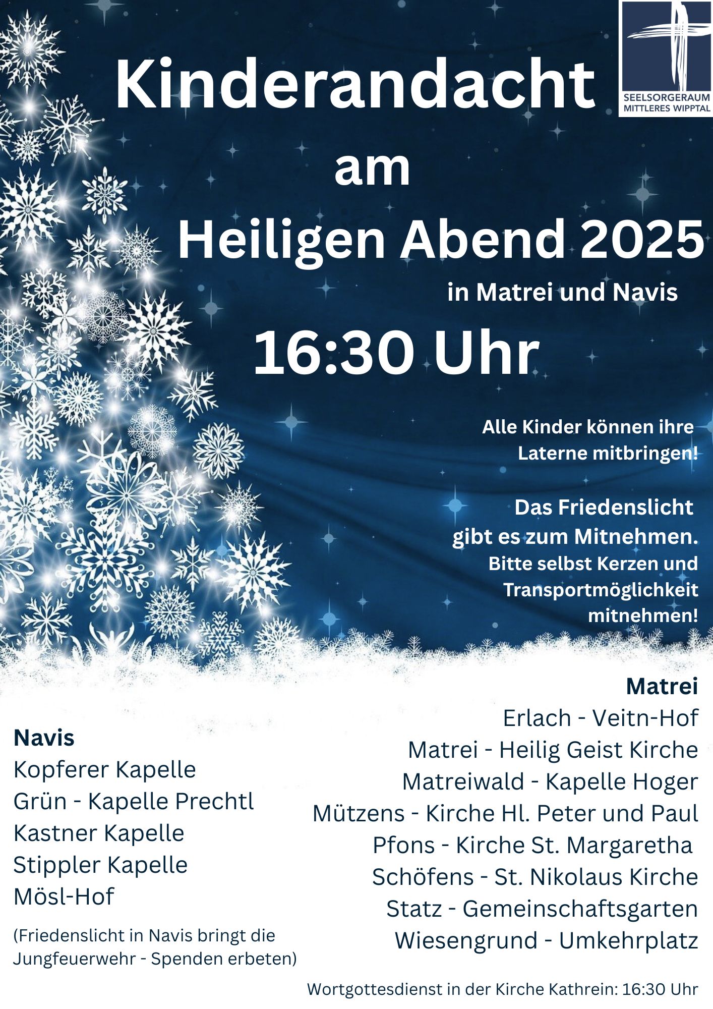 Hier sind alle Gottesdienste für die Pfarren Gschnitz, Matrei und Navis bis zum 6. Jänner zusammengefasst: